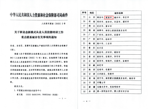威海市入选全国首批新业态新模式从业人员技能培训工作...