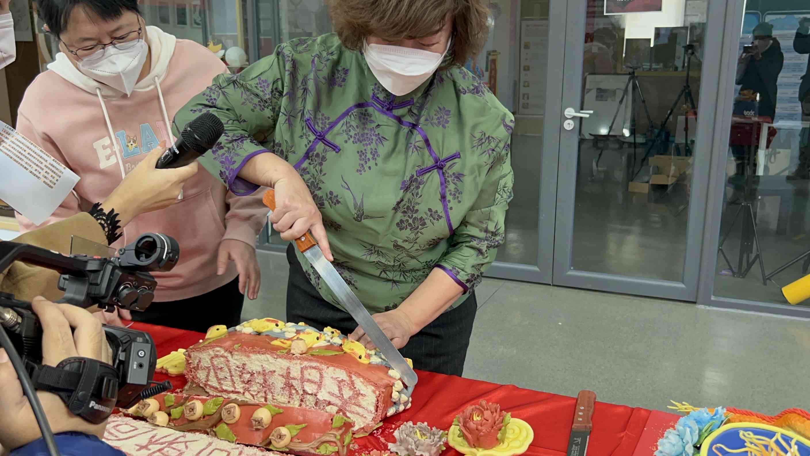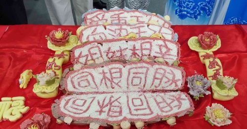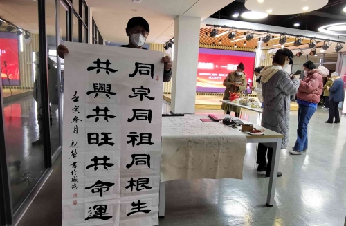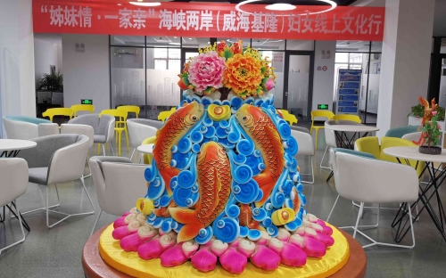 威海现场为活动特别制作的切字花饽饽和花饽饽对联,不仅展现了威海“非遗”传承人非凡的技艺,也加深了屏幕两端姐妹乡亲的浓厚情谊。社区艺术团精心准备的胶东特色舞蹈《第四套秧歌》、京剧选段演唱和歌伴舞《海滨小城威海卫》让活动现场气氛更加热烈,社区妇女同胞载歌载舞,欢迎海峡对岸的亲朋好友常回家看看。环翠区老年大学邵起声老师的书法作品《两岸同根一家亲》为活动画上圆满句点。
