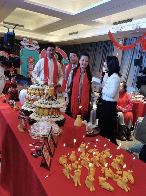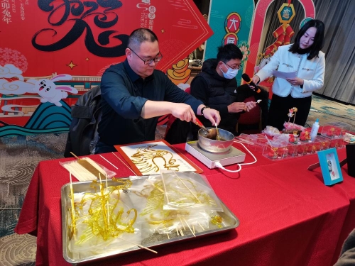 云端再庆团圆年,“非遗”民俗迎元宵。今年是两地乡亲在云端同庆新春、喜迎元宵的第三年,随着疫情的消散,大家都对新的一年满怀期盼,盼望着早日相见、盼望着阖家团圆。山东省台属联谊会副会长、威海市台胞台属联谊会会长李杰为台湾的乡亲送上新春祝福,威海现场特别为嘉宾们准备了红围巾和“福兔”花饽饽,嘉宾们在李会长的带领下集体向台湾亲友拜年,祝亲朋好友在兔年事业红红火火、生活和和美美。基隆市山东同乡会理事长刘建国代表基隆的各位乡亲感谢来自家乡的祝福,他相信“云端”见面的日子很快就会过去,归家有期,团圆不远,期待今年能回家团聚。两位威海花饽饽“非遗”传承人为即将到来的元宵节准备了面属、面灯,威海独有的锡镶技艺传承人为大家展示了精美的锡镶画。制作糖画和面人的老师,现场展示非凡技艺,灵巧手指上下纷飞,寻常的面团和糖浆转眼间就变成了栩栩如生的小兔子呈现在大家眼前,两地乡亲仿佛置身于春节庙会,共享浓浓年味。
