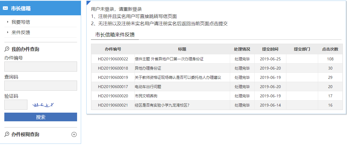 可以根据写信后的办件编号和查询码进行查询。也可以进行关键字查询已经公开的信件。